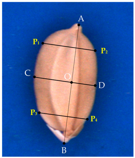 Key lines (Figure 3) defined by the contour of a seed are related to the geometric features of the seed. , , , , , , and O were identified according to a contour-following algorithm [9]. The features of the seeds are defined as follows: