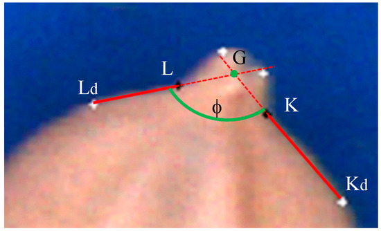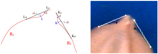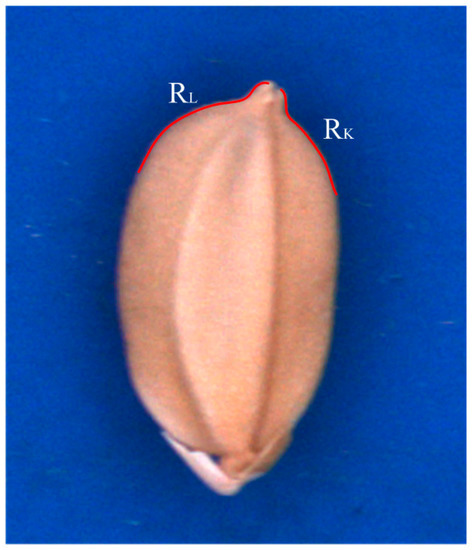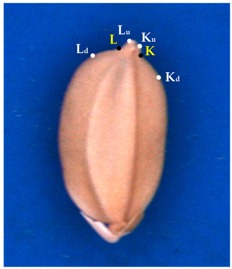 In this study, several special geometric features were extracted to identify seed varieties TK9, TN11, and TK14. Two concaves (RK and RL) to the side of the chaff tip are indicated by red curves in Figure 5. Points L, Lu, Ld, K, Ku, and Kd (Figure 6) on the concaves were crucial for feature extraction. The hull points Ld, Lu, Ku, and Kd of the seed contour were obtained using the convex hull algorithm [10].