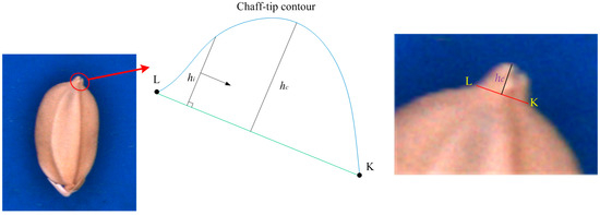 - The height (hc = max(hi)) of the chaff tip is the maximum height of the chaff tip from , where di is the distance between a point on the chaff-tip contour and , as illustrated in Figure 7.