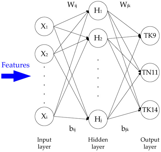 where ni and no are the number of input and output nodes, respectively, k = −2, 0, 2. The structure of the BPNN classifier is illustrated in Figure 10, wherein Wij and bij are the weight and bias of the input layer in the hidden layer and Wjk and bjk are the weight and bias of the hidden layer in the output layer. Xi, Hj, and Ok denote the input layer, hidden layer, and output layer values, respectively.