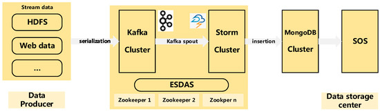 Before designing the architecture of ESDAS, there are two points to consider. One is that the architecture should consider the uninterrupted characteristic of streaming data. As the streaming data are continuous and uninterrupted, they are different from static data, so the streaming data processing tool should be applied. Another is that the architecture should be a Service Oriented Architecture (SOA) [23] so that the architecture is flexible and extendable. Figure 1 shows the architecture of ESDAS. The architecture contains three parts: a data producer, a storm layer and a data storage center. The data producer refers to the producer of streaming data. The storm layer refers to the Apache Kafka [24] and Apache Storm clusters. Storm is one of the most popular frameworks for real-time stream processing. It provides the fundamental primitives and guarantees the fault tolerance required for distributed computing in high-volume, mission-critical applications [25]. Apache Kafka is a high frequency per second distributed publish-subscribe message system, supporting Hadoop parallel data loading. In the vehicle networks, the streaming data exist in a high frequency per second manner, as the storm cluster is unstable when the streaming data exist in a high frequency per second manner. Therefore, we introduce Apache Kafka to support the streaming data serialization and data transmission in our study. The data storage center is the MongoDB cluster. MongoDB is a typical high performance NoSQL database. The SOS in ESDAS serves as a web service and receives the data insertion requests and data access requests. The Open Geospatial Consortium (OGC) defines the SOS as the one service that provides a standard application [26,27]. The programming interface manages the deployed sensors and retrieves the sensor data. So the spatio-temporal data in MongoDB can be accessed via the SOS.