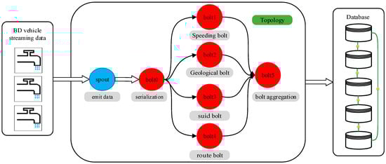 As shown in Figure 2, the spout/bolt workflow in a topology is described as follows. Blue parts stand for the spout phase, and red parts stand for the bolt phase. The BD vehicle streaming data are the data source of the streaming data. The entrance of the topology is the spout, which is used to emit data. As the data in BD vehicle streaming data are out of order and irregular, the data are serialized in the data initialization unit. After data initialization, the data from the spout are in object sequence. In the bolt process, as shown in Figure 2, there are six bolts, from bolt0 to bolt5, including the speeding bolt, geological bolt, suid bolt, route bolt, and aggregation bolt. The speeding bolt is used to filter the speeding data in BD vehicle streaming data; the geological bolt is used to filter the BD vehicle streaming data whose geographical position is outside of Taiyuan City; the suid bolt is used to filter the BD vehicle streaming data whose bus ID is not within the reasonable ID range; and the route bolt is used to filter the BD vehicle streaming data whose bus line is outside of the common bus lines. After the processes of the speeding bolt, geological bolt, suid bolt, and route bolt, the data will aggregate in the aggregate bolt.
