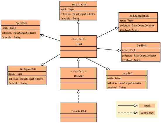 In speeding bolt, geological bolt, suid bolt, rout bolt, and aggregation bolt, the bolt implementation should be described. In the IBolt interface, there are three interface functions: prepare(), execute(), and cleanup(). When a worker executes the Bolt, the prepare method is first called in the context of the current execution. The execute method accepts a tuple for processing and uses the prepare method of the incoming OutputCollector ack method (expressing success) or fail (indicating failure) to feedback processing results. For the spout/bolt design in Section 2.2, the interface extension should be explained further. The prepare method remains unchanged. How to extend the execute method is essential. The filter process should be achieved in the execute method. As the filter function is the threshold comparison process, the filter function should be a judge process. For example, to filter the speeding data, the judgement “if the tuple.speed ≥30 return tuple; else {}” is made. Similar to other filter processes, these judge processes can be instantiated. As shown in Figure 3, speedBolt, GeologicalBolt, routeBolt, SuidBolt, and boltAggregation inherit the IBolt interface. The input is the Tuple element, while the parameter is the BasicOutputCollector and threshold characteristic.