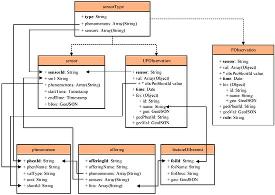 As Figure 4 shows, the data tables in MongoDB contain seven sub-data tables, containing a sensorType table, a sensor table, a UFObservation table, an FObservation table, a phenomenon table, an offering table, and a featureOfInterest table. The UFObservation table is applied to store the raw data of BD streaming vehicle data, and the FObservation table is applied to store the filtered data of BD streaming vehicle data. The designs of the data tables in MongoDB for storing streaming spatio-temporal raw data, filtered data, and metadata are mainly shown as follows. The sensorType table stores the sensor type information of the sensors and phenomena; the sensor table stores the sensor information, including the sensor metadata, the time when the sensor begins observation and the time when the sensor ends observation; and the phenomenon table stores the phenomenon information, including the phenomenon name, observation value type and unit information. The offering table stores the organization information, including the organization name, phenomenon name and sensor information, and the featureOfInterest table stores the spatial arrangement of observations, including the name and coordinates encoded within the GeoJson data type. The data tables are different from others, such as the data table in The Hadoop Distributed File System [33] and are shown as follows: