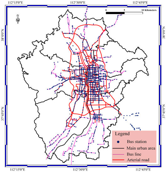 The six city areas and the spatial distributions of bus stations, bus lines and arterial roads in Taiyuan City, Shanxi Province, China.