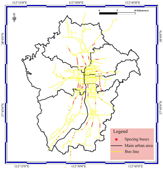 In the data access phase, BD vehicle streaming data are inserted into the Storm cluster at a high frequency and undergo data filtering. Therefore, the stored data contains the filtered data and unfiltered data. In this section, the filtered bus aggregation mapping with the speeding bolt, suid bolt, geographical position bolt, and route bolt have been achieved. In our experiments, the filtered data contain different speed data, location error data, license plate number error data, and route error data. In the speed bolt, the velocity threshold is 30 km/h, which means the bus is speeding when the velocity is greater than or equal to 30 km/h. The speeding data locations in the main urban area of Taiyuan City are shown in Figure 6. As shown in the figure, the red spots stand for the speeding buses; the yellow lines stand for bus lines; and the black lines stand for the main urban area. Most of the speeding buses are distributed in the main urban area and on the main roads in Taiyuan City.