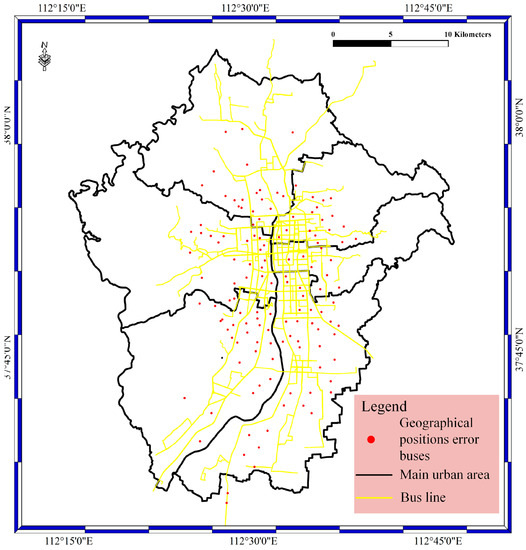 For the geological bolt, the geographical position data are filtered with the specified filter rule. Geographical position filtering is achieved by a judgment of if the geographical position is near the bus lines or near the urban area. In this bolt, the filtering occurs by judging if the distance between the geographical positions and bus lines is greater than or equal to the specified value. In our experiments, the value is set to 10 m, with consideration of system error and random error in geographical positions. In the bolt, the execute method is implemented, and the judgment phase is carried out. The prepare method is used to catch the data from the spout phase. Figure 7 shows the geographical position error results of the geological bolt phase. The red spots stand for the geographical position error of buses, as well as the geographical position error of buses located far from the main roads instead of on the main roads.