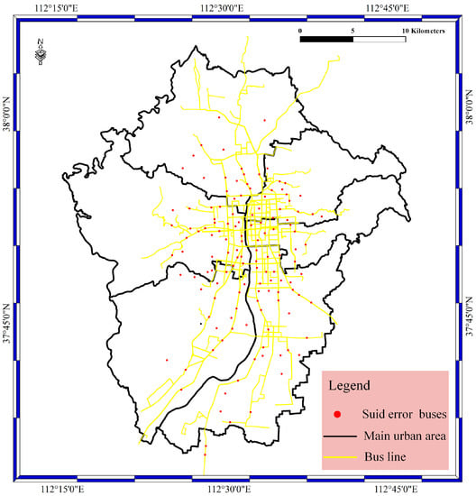 For the suid bolt as shown in Figure 8, the bolt is designed to filter the BD vehicle streaming data. The suid refers to the license plate number. In the suid bolt phase, the buses without correct license plate numbers are filtered out based on whether the license plate number is in the bus license plate number database. The bus license plate number database was constructed before the experiment. In this way, the license plate number error result is determined in the suid bolt. The red spots stand for the buses with false license plate numbers. In addition, most of the buses with false license plate numbers are located on the bus lines, and a small number of spots are located in the main urban area.