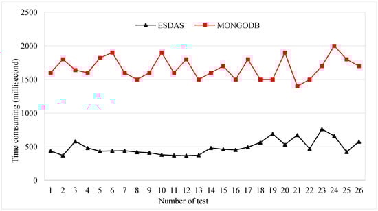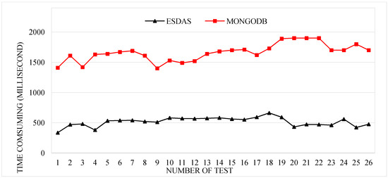For the suid bolt phase, the consumption times for ESDAS and MongoDB are evaluated. The suid bolt result has been described in Section 3.2. In the five thousand, ten thousand, thirty thousand, and fifty thousand records per second cases, the consumption time is evaluated. Figure 11 shows the consumption time for the suid bolt for ESDAS and MongoDB in the ten thousand records per second case. The mean consumption time of ESDAS for the suid bolt is approximately 400 ms, and the consumption time of MongoDB is approximately 1800 ms. The efficiency of ESDAS for the suid bolt is approximately three times higher than that of MongoDB.