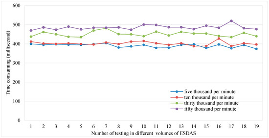 Figure 10 shows the consumption time of ESDAS for the different data volumes of five thousand, ten thousand, thirty thousand, and fifty thousand records per second. For the different data volumes, the consumption times are different. The consumption time is evaluated approximately 20 times. The mean consumption time of ESDAS for five thousand records per second is approximately 400 ms, the consumption time for ten thousand records per second is approximately 600 ms, the consumption time for thirty thousand records per second is approximately 500 ms, and the consumption time for fifty thousand records per second is approximately 700 ms.