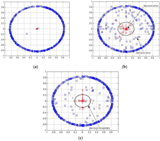 Figure 3b,c show the recovery constellations of reconstructed symbols at the destination with different signal/noise ratios at the transmitters. It can be seen that reconstructed symbols are more concentrated near the center with a higher SNR. The inner black circle is the decision boundary, and the red dots represent the symbol of inactive nodes. The red dot symbol inside the decision boundary is considered as the inactive node, while the one outside the decision boundary is considered as the active node where the decision error occurs. In order to decrease decision error such that the inactive node is considered as active one, the training sequence is used to determine the boundary. Moreover, the training sequence is used to estimate the channel matrix. The furthest distance between zero and all reconstructed training sequence symbols of inactive nodes is set as the decision boundary, as indicated by the dotted line in Figure 3b,c.