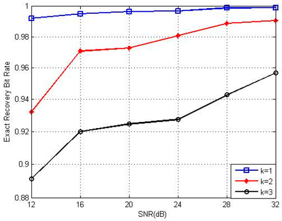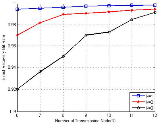 Figure 5 shows the results of the exact recovery bit rate with different total transmission node () values. As increases, the system becomes sparser. It can be seen that the sparser the system is, the higher the exact recovery bit rate will appear to be. The performance improves when there are more inactive nodes.