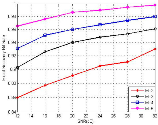 We show the relationship between the number of receiving antennas M and the exact recovery bit rate in Figure 6. The four lines in Figure 6 indicate the exact recovery bit rate with different receiving antennas M. We found that the largest M system has the highest exact recovery bit rate, which means that a large number of receiving antennas will be beneficial for the correct transmission of the system. This is because the more receiving antennas there are, the more measured values will be received.