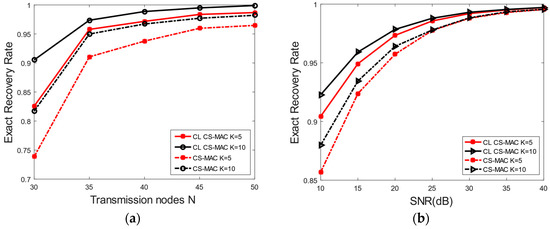 Figure 7 shows the comparison of the exact recovery rate of the CL CS-MAC and CS-MAC with the transmission node number and the SNR. It can be seen that the exact recovery rate of CL CS-MAC is higher than that of CS-MAC with the same transmission nodes and SNR. The same trend is also shown in Figure 8, where the exact recovery rate of CL CS-MAC is higher than that of CS-MAC with the same SNR. This means that the CL CS-MAC scheme can identify the exact active node more accurately than the CS-MAC scheme.