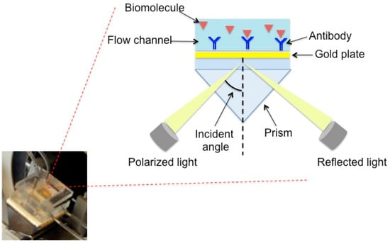As shown in Figure 1, the SPR flow device has a prism as the main component, installed on a rotating plate. The instrument is automatically controlled by a computer, and the samples are introduced into the cell by means of a peristaltic pump. The sensor consists of a gold sheet that is 50 nm thick and is placed on a glassy support using oil with a refractive index equal to that of the prism. To observe the SPR phenomenon, the polarized light is reflected from the wafer on a detector and monitored as a function of the resonance angle. After the formation of the complex between antibody and analyte, the SPR angle changes and this variation is proportional to the concentration of the solutions.