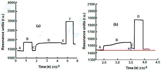 Then, the phosphate buffer was allowed to flow to remove the excess of the EDC/NHS mixture with a lowering of the signal (Line C, Figure 2a). After the activation step, a phosphate buffer containing a concentration of 0.5 g·L−1 of anti-ampicillin antibodies was allowed to flow over the sensor surface for 20–30 min to achieve a covalent cross-linking of the amino reactive groups of antibodies with the aldehyde terminals (Line D, Figure 2a). Finally, after washing with the buffer solution (Line E, Figure 2a), the non-reacted, activated groups were deactivated by treatment with ethanolamine 10−3 M for 10 min in order to avoid non-specific adsorption (Line F, Figure 2a). As shown in Figure 2a, anti-ampicillin was effectively immobilized on the sensor surface. The baseline, after the ampicillin immobilization step, is located at an r.u. (Units of Resonance) value greater than the baseline before the antibody immobilization.