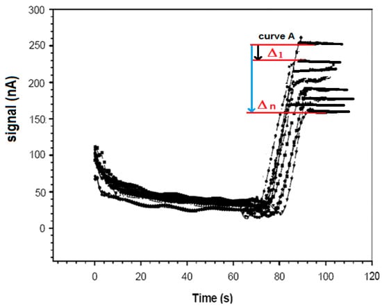 In detail, the ampicillin sample to be determined was added to 5 mL of a new phosphate buffer solution 0.1 M (pH 7.4) restored in the measurement cell, together with a fixed concentration of 50 μL (10 mg·mL−1) of ampicillin–biotin–avidin–peroxidase conjugated (final concentration 0.93 × 10−6 M). For 1 h, the enzyme-conjugated ampicillin was allowed to compete with the non-conjugated ampicillin that was free in solution that try to bind the anti-ampicillin immobilized on the Immobilon membrane. After washing with the same buffer solution to remove all unbound labeled ampicillin, the specific substrate of the enzyme, i.e., 25 μL of a 1% (v/v) H2O2 solution, was added to the renewed buffer solution in which the immunosensor was dipped, and the mixture was then stirred. The ensuing enzyme reaction was catalyzed by the enzymatic marker. The measured signal (nA) correlated directly with the ampicillin concentration to be measured. In this case, hydrogen peroxide produced a signal that increased with increasing concentrations of ampicillin free in solution. The higher the amount of ampicillin bound to the antibody immobilized on the Immobilon membrane, the lower the H2O2 consumed in the enzymatic reaction and the stronger the signal of the H2O2 amperometric electrode. The final signal was obtained by measuring the difference between this signal and that of a blank measured under the same conditions, but the latter was measured using a probe without the antibody complex immobilized on the membrane (see Figure 4).