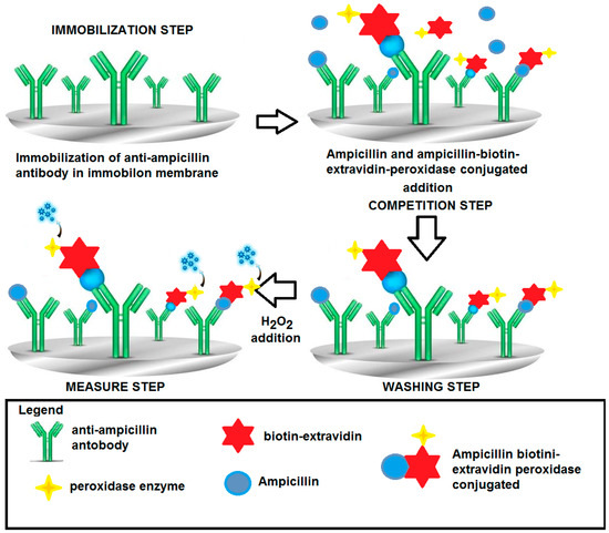 The same competitive format for penicillin, described in detail in previous papers [22,23], was used, i.e., the ampicillin, free in solution, to be determined was allowed to compete with a fixed supply of the ampicillin labeled with biotin–avidin–peroxidase for the ampicillin antibody immobilized on the membrane (Immobilon) in order to produce the antigen-antibody immunocomplex.