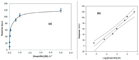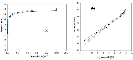 (a) Behavior of the response of the direct method based on flow SPR vs. concentration, for ampicillin determination. (b) Calibration curve using a semi-logarithmic scale and confidence interval, obtained by the direct method, based on flow SPR, for ampicillin determination.