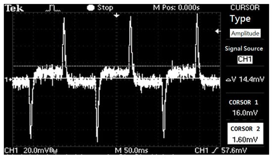 As illustrated in Figure 1, the flow signal’s change depends on the amplitude wave of the excitation at the moment it senses. The flow signal is proportional to the amplitude of the excitation wave. We should avoid the differential interference when calculating the amplitude []. The differential interference occurs as a result of the excitation direction of the coil, which is varying. Furthermore, the differential interference has a fixed size based on the excitation current. The flow signal is larger, and the excitation signal’s amplitude is larger as well. Additionally, it can cover the wave of differential interference.