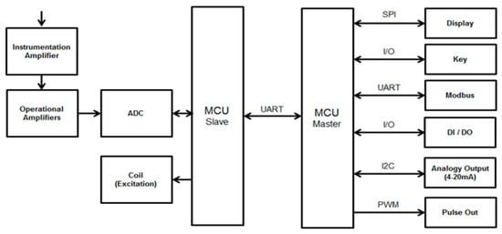 Figure 2 illustrates the hardware block of the MCUs in the DSC. The MCU master is responsible for controlling the UI (user interface). The LCM (Liquid Crystal Module) signifies that the detection of the key adds the analogy output. The flow signal enters from the sensor. Because its signal is extremely small, the highest flow amplitude voltage depends on the mV. The instrumentation amplifier creates a larger signal, which becomes even larger when passing the OPA (Operational Amplifier). The signal passes the ADC (analog to digital converter), and it is selected by the MCU slave afterwards. It produces the flow signal’s detection and the algorithm’s calculation.