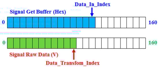 As illustrated in Figure 4, when conducting the original flow rate signal acquisition, the counter Data_In_Index will increase after obtaining a flow rate signal. This process is repeated until the entire signal cycle is fetched (i.e., 160 slots). When the Data_In_Index increases, the Data_Transform_Index is used to check whether the signal needs to be converted. The advantage of this approach is that it allows the signal to be acquired and converted into parallel processing, and thus, it saves time and improves the conversion efficiency. Additionally, it can avoid the inability to detect the flow rate in real time due to the delay of signal acquisition.