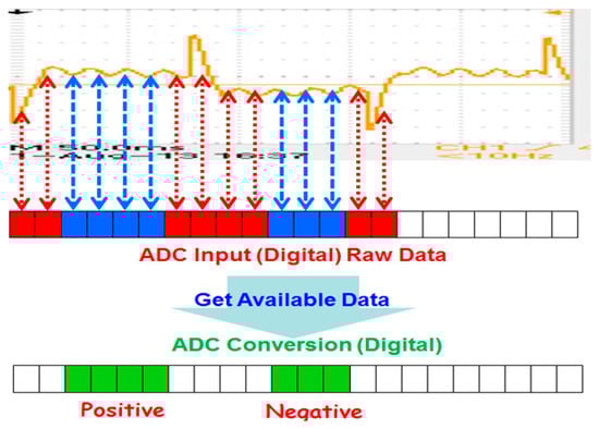 Based on the Nyquist sampling theorem, the sampling rate (fs) must be twice as large as that of the highest frequency test signal. For example, the algorithm takes a 1 kHz signal and brings the duty to 160 ms (6.25 Hz). The signal is converted and stored in the memory of the MCU when the synchronization signals appear. The stored data are the original flow rate signals. Based on the synchronization signals, the data in the MCU can be categorized into positive and negative cycles. Therefore, they can be processed in the next stage of the flow rate’s calculation algorithm.