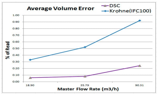 Figure 12 depicts the average volume error comparison between the DSC and Krohne (IFC 100, 0.5%). The results indicate that, for the Krohne device (IFC 100, 0.5%), the error in the higher flow rates is higher; the rate is better in the low flow. However, the error in the DSC is more stable and lower on average. The average volume error trend of the DSC is poor in the areas with high flow rates and better in the areas with low flow rates, which is similar to the Krohne device. As illustrated in Figure 13, the max average volume error is 0.18 percent. The Krohne device’s (IFC 100, 0.5%) value is 0.92%.