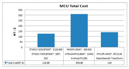 As shown by the prices provided in Figure 17 of the processor cores for the MCU, the price of the DSC is nearly 2.5 less than that of the Krohne (IFC 100, 0.5%) and approximately 10% less than that of the wavelet transform algorithm; however, the average volume flow rate and the reproducible performance of the DSC are not inferior to those of the Krohne (IFC 100, 0.5%) and the wavelet transform algorithms. Table 4 summarizes the results of the proposed DSC algorithm in comparison with the other algorithms. From Table 4, it can be noted that the proposed DSC algorithm has the smallest average volume error and total cost. The repeatability error of the proposed DSC algorithm is comparable to that of the Krohne IFC 100 but is smaller than that of the other algorithms.