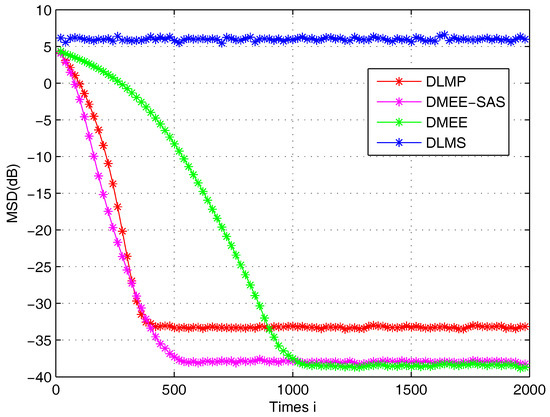 We set the window length and kernel size for both DMEE and DMEE-SAS algorithms. Furthermore, the p is 1.2 for the DLMP algorithm. The steady state MSD curves are plotted in Figure 2. It is found that the DMEE-SAS algorithm is robust to the non-Gaussian noises and performs better than the DLMP algorithm [26] and DLMS [12]. The DMEE-SAS algorithm achieves a better convergence performance than the DMEE [31] algorithm when the DMEE-SAS and DMEE algorithms achieve comparable performance.