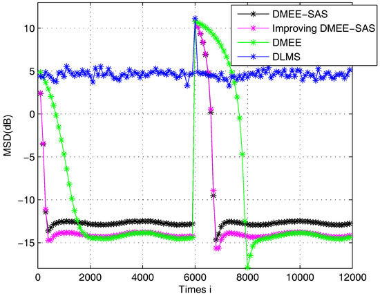 The unknown link is assumed to change at time 6000. In Figure 3, the Improving DMEE-SAS algorithm can detect the weight vector change and the performance of it is better than the DLMS algorithm. We observe that Improving DMEE-SAS and DMEE algorithms achieve comparable performance and Improving DMEE-SAS achieves better convergence performance than the DMEE algorithm. When compared with the DMEE-SAS algorithm, the Improving DMEE-SAS algorithm exhibits a significant improvement in performance when the estimate is close to the optimal estimator. The Improving DMEE-SAS algorithm achieves a low MSD and fast rate of convergence in the non-stationary environment.