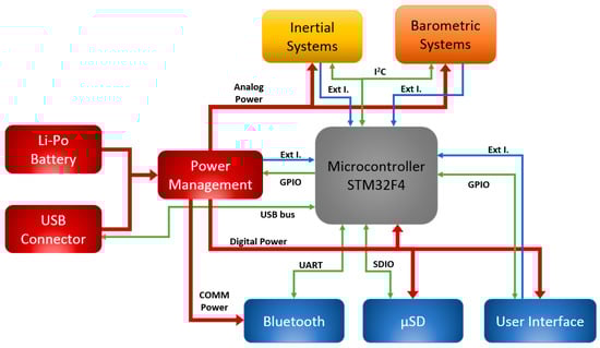The microcontroller is the core of the system and its main goal is to manage all the peripherals and devices that constitute the 9 × 3 in addition to executing the algorithms embedded. In Figure 1, the main scheme of the system is shown, reporting the main communication lines between the components.