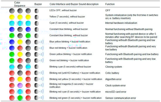 The status LED provides information of the different processes of the device as shown in Figure 4. There are different working modes, but there is also an error coding in case the system presents a failure related to clocks, microSD writing process, communications or algorithms. The buzzer helps the user to identify the status of the system, for example, when battery charge is low.