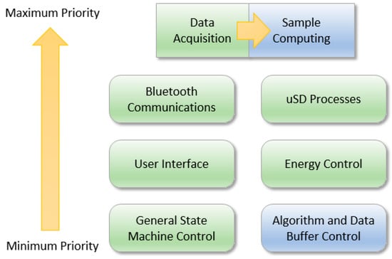 Figure 5 shows the main blocks that represent the different processes that interact within the firmware. Green blocks are those corresponding to the hardware control and the blue ones correspond to the algorithmic block. They are sorted according to their priority of execution, being those on the top the ones with higher priority and those on the bottom the ones with lower priority. This priority enables to decide the process to be executed whenever there is a conflict. According to Figure 5, those blocks that are at the same level have the same priority, and only a higher priority task can interrupt them.