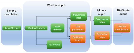 Kinesia-360™ is a dual inertial system that consists of two sensors, one mounted on a wrist and another one placed in patients’ ankle. Both devices include a triaxial accelerometer and gyroscope. Kinesia system also includes a mobile phone application, which is used as an interface between the system and the user. Furthermore, this data is also sent to an external server in order to ensuring data protection. Kinesia system provides information about tremor [], dyskinesia [] and mobility based on temporal and frequency features. The outcomes of the algorithm are gathered in a file, which is updated every 2 min with a new result. Great Lakes NeuroTechnologies has also released Kinesia ONE, which also provides results in form of indexes from bradykinesia, dyskinesia and tremor. However, this system is thought to be used under scripted tasks following an app provided by the same company []. This system is composed of a small inertial system which is worn on the finger; this way, after executing specific tasks such as finger tapping, it enables the objective quantification of some PD symptoms such as bradykinesia.