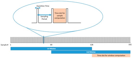Process execution time. In blue, data acquisition and sample calculation time are shown. In red, window computation is represented, and, in green, stands for the microSD card writing process.