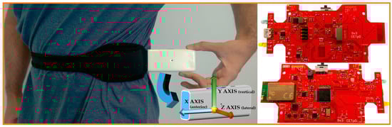 Furthermore, due to the described clinical protocol conditions, the 9 × 3 has to accomplish some prerequisites regarding the size and weight taking into account that the system should be worn close to the human centre of mass. In this sense, some studies have been found related to the position to wear a sensor. According to Yang et al. [] and Gjoreski et al. [], the waist location is interesting from the biomechanics point of view, since it is close to the centre of mass of the human body, and it also provides good ergonomics to patients. Furthermore, in the same line, Mathie et al. [] conducted a survey that confirmed the lateral of the waist above the iliac crest as the most comfortable site to place an IMU. Therefore, considering this rationale, the waist has been chosen as the most suitable place to wear the 9 × 3, which was also chosen in the previous version of the device.