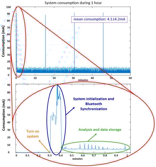 The system includes a Bluetooth module in order to synchronize date and time through an external device (such as a smartphone) and a microSD card to store inertial data or the algorithm results. The firmware of the system consists of different blocks managed by a policy of priorities that interact among them. In addition, the system goes to sleep each time it is inactive. As a result, the system can be used in long-term monitoring conditions. According to the measured current, the system has an autonomy of 12.3 days with a 1200 mAh battery satisfying the proposed requirements in Section 3.