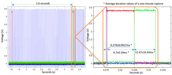 In this Section, we present the duration of the processes when the algorithms are executed (Test 4 Section 6.1). Figure 10 shows one of the obtained outputs. The microcontroller worked at 168 MHz and the sampling frequency of inertial data was 40 Hz, which is managed by the real-time clock peripheral (RTC). The RTC interrupts the program at every sample time. As shown in Figure 10, window computation is executed every 1.6 s. Once the RTC interrupts the program, a sample is received, filtered, and stored within the internal microcontroller memory. In case of completing a window, the program proceeds to compute the algorithms of bradykinetic gait and FoG to the signal contained in it. Figure 10 shows in red the duration of the computation process associated to the end of each window, which is about 20 ms.
