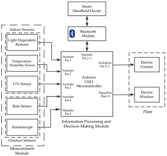 This section describes the backbone of the system, which comprises several modules. Figure 1 illustrates an overview of the system architecture for the proposed system indicated modules and their interactions. These are “measurement module (compact weather station)” sensing and measuring environment physical quantity and then sending them to Arduino UNO, which is the Arduino’s flagship board; “information processing and decision-making module (Arduino UNO microcontroller)” processing the measured signals and sending an adequate command to windowsill; “Bluetooth module” which provides the wireless communication between SHD and Arduino; “SHD” monitoring the measured information and sending the command to Arduino and the module “plant (windowsill)” which is controlled by Arduino. A brief description of the modules is further explained in the following subsection.