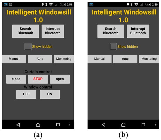 MIT App Inventor is a drag-and-drop visual programming tool for designing and building fully functional mobile apps on the Android based platform. It allows Android apps to be built and programmed with colorful building blocks instead of programming codes. An IWS mobile app was developed using MIT App Inventor 2 for SHD. Three modes of operation can be selected when the SHD is connected to Bluetooth. In Figure 3, two screens of the mobile app are shown. Figure 3a is the default screen that operates in manual mode. The block “show hidden” is a small utility that will display all hidden information on the SHD. The blocks “close” “STOP” and “open” are the selection for controlling the electric curtain, and the blocks “OFF” and “ON” are the selection for controlling the electric window. Figure 3b is the screen of auto mode. Under this mode the windowsill will be automatically controlled based on the design fuzzy rules. In monitoring mode, as shown in Figure 4, the SHD will automatically display the measured information from the measurement module, including humidity, temperature, illumination, air quality, rain detection and wind direction. The shown air quality is normal—that means the range of CO2 concentration is from 700 ppm to 2800 ppm in the room. The user can quickly access the measured environment information.