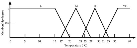 Designing a fuzzy controller is a simple concept that includes the three stages: fuzzification (an input stage), rule evaluation (a processing stage) and defuzzification (an output stage) []. The developed fuzzy logic control strategy for the IWS was designed in MATLAB using max–min inference and centroid defuzzification. A comprehensive fuzzy algorithm involving indoor temperature, indoor illuminance and indoor CO2 concentration is proposed to evaluate living comfort. The fuzzy inference model is Mamdani with three inputs (indoor temperature, indoor illuminance and indoor CO2 concentration) and two outputs (electric curtain and electric window).