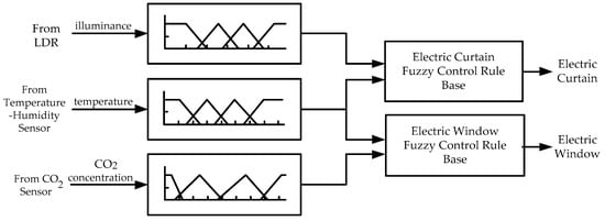 The module is the core of the proposed IWS. It includes two main units: information processing unit and decision-making unit. Considering the environmental conditions provided by the measurement module, the information processing and decision-making module must access the information and provide an adequate command to the windowsill drivers to regulate the plant. The decision-making module provides two ways to control. One way is fuzzy control based on the measured information from indoor sensors for maintaining indoor comfort. The fuzzy control is designed to achieve the requirements based on the designed fuzzy rule base. With the fuzzy control applied, the electric curtain and electric window can maintain their required positions for comfort. Another way is direct control based on the sensed conditions from outdoor sensors for preventing rain from splashing.