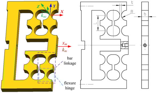 Concerning the motion transmission and guiding mechanism, right-circular flexure hinges are adopted. The flexure hinge is characterized by non-friction and non-stiction based on the elastic deformation of a solid material. Shown in Figure 1, a double parallel four-bar linkage mechanism is designed to avoid planar coupling motion in other directions than the applied force. Two flexure hinges form one-bar linkage, and two-bar linkages make up one parallel linkage mechanism, and then two parallel linkages finally constitute the designed double parallel linkage mechanism. Therefore, the mechanism is composed of eight right-circular flexure hinges.