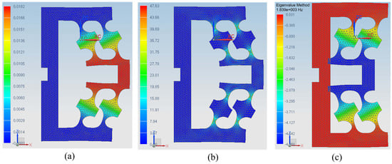 FEA results of the mechanism: (a) maximum displacement is 0.0182 mm; (b) maximum Von Mises stress is 47.63 MPa; (c) natural frequency in the actuated direction is 1839 Hz.
