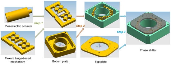 The phase shifter is assembled with three piezoelectric actuators, three flexure hinge-based mechanisms, one bottom plate, one top plate and some screws. As shown in Figure 3, the assembly procedures can be executed step by step as follows: