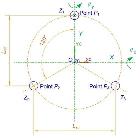 In Equation (5), Z represents the linear displacement of the phase shifter on the z-axis, and are the angular displacement of the phase shifter on the x-axis and y-axis, respectively, , and are the linear displacement of the three points , and of the top plate on the z-axis, respectively. Z is usually described by the linear displacement of the mass centroid, i.e., the origin O. , and are generally measured using the displacement sensors. In the ideal condition, if the three actuated linkage mechanisms have the same displacement and thus result in the equal displacement , and of the three points , and , the phase shifter will only move in the direction of the z-axis with .