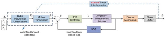 The semi-closed loop control strategy is employed for a trade-off between accuracy and cost. As shown in Figure 5, there are two control loops: inner closed loop for feedback control and outer open loop for feedforward control. The inner loop uses discrete-time incremental PID control algorithm [23,26] in Equation (6) to guarantee accurate displacement of the piezoelectric actuator. The feedback displacement is supplied by built-in SGS. The outer loop adopts cubic polynomial linearization in Equation (7) and Jacobi motion transmission matrix in Equation (8) to compensate for the nonlinear relationship of displacement between the actuator and phase shifter.