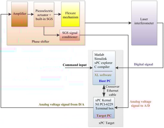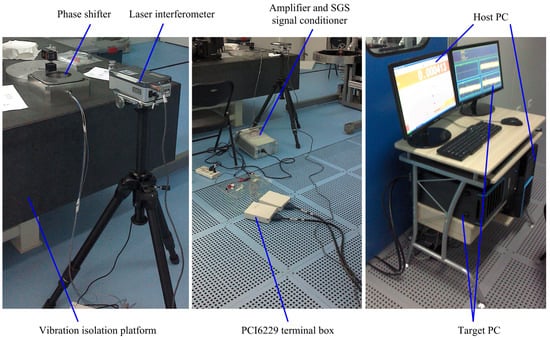 The experiments are carried out in a laboratory under precise environmental control. The temperature of the laboratory is kept at 22 ± 0.06 Celsius. The laboratory is also constructed as a class 1000 clear room. The environment of this kind gives a sufficient guarantee for ultra-precise displacement measurement. The experimental equipment is shown in Figure 7, which mainly consists of three parts: (1) phase shifter, (2) laser interferometer and (3) xPC Target™ 4.2 of MathWorks, Inc. in Natick, MA, USA. The phase shifter is placed on an optical vibration isolation platform for rejecting external vibrational disturbance. Illustrated in Figure 8, the experimental schematic diagram shows the main components , the signal flow and data transfer. The three parts and their relevant components of the experimental equipment could be introduced as follows: