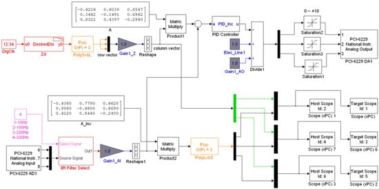 The original Simulink model for the real-time semi-closed loop control target application is shown in Figure 9. The blocks PolySvsL, A and PID Controller are used for cubic polynomial linearization, motion transmission matrix and PID controller, respectively. Scope blocks are utilized for data displaying and recording. Other blocks such as PCI-6229 AD1 and PCI-6229 DA1 in the xPC Target library provide real-time interfaces to the NI PCI-6229 board, through which the Simulink model can collect the analog voltage signal from SGS and send the analog voltage signal to the amplifier. The sampling time is 1 ms and other parameters of the controller are as follows: